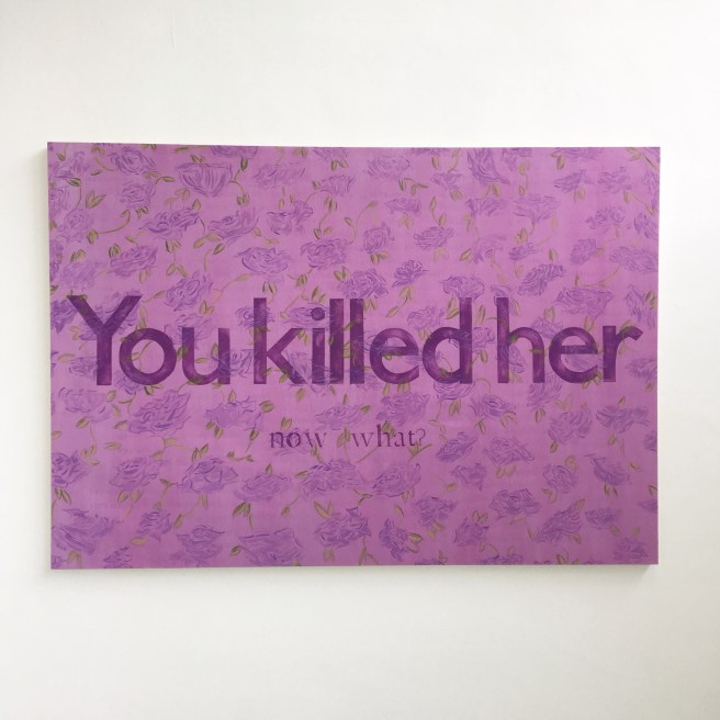 The second thing which is created through art is awareness, creating a visual which alarms the viewer, leaving an imprint on their mind. One man said to me whilst observing my large pink painting with the text ‘you killed her’ (1.7m x 90) ‘it isn’t something I’d have in my living room’. No, no it’s not.